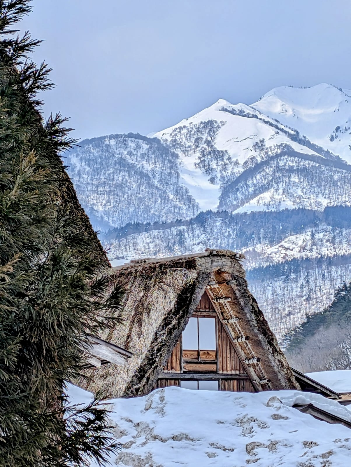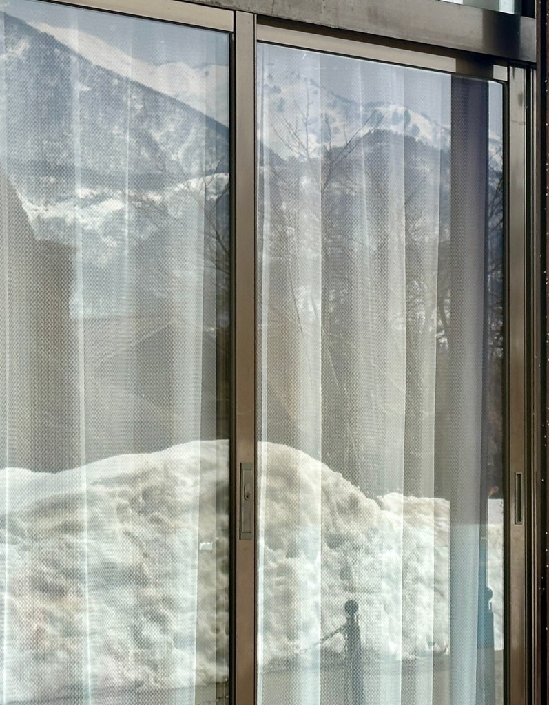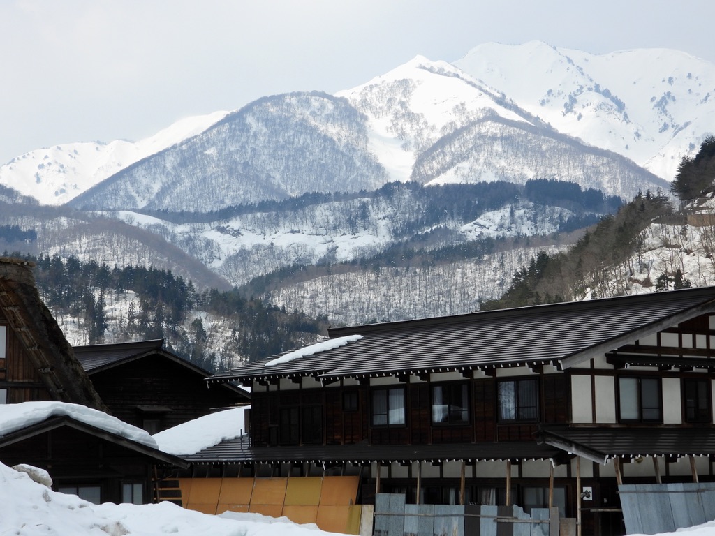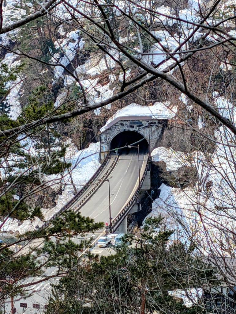 The route from Takayama to Kanazawa winds through cedar-clad, snow-blanketed mountains – and when I say “through,” that’s exactly what I mean. We traversed a succession of tunnels, some several kilometers long, separated by a few hundred meters of above-ground road. Those brief open-air passages were stunning, particularly out the left side of the bus. Alas, I was seated on the right. If you ever travel with me, keep in mind that whichever side I sit on will be (1) baking in sunshine, and (2) across the aisle from the most striking mountains/lakes/buildings.
