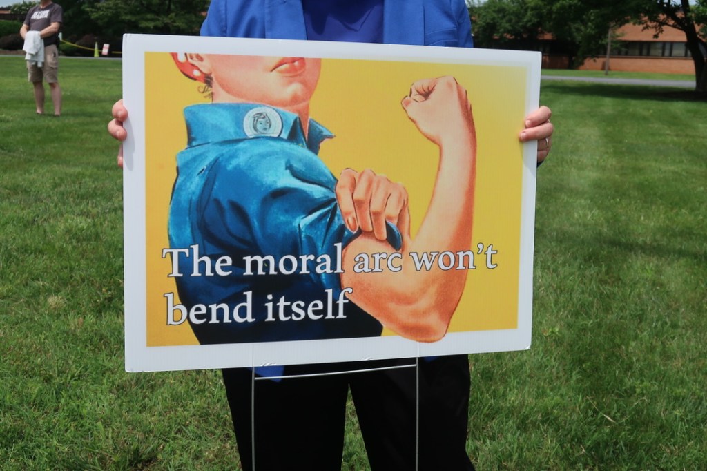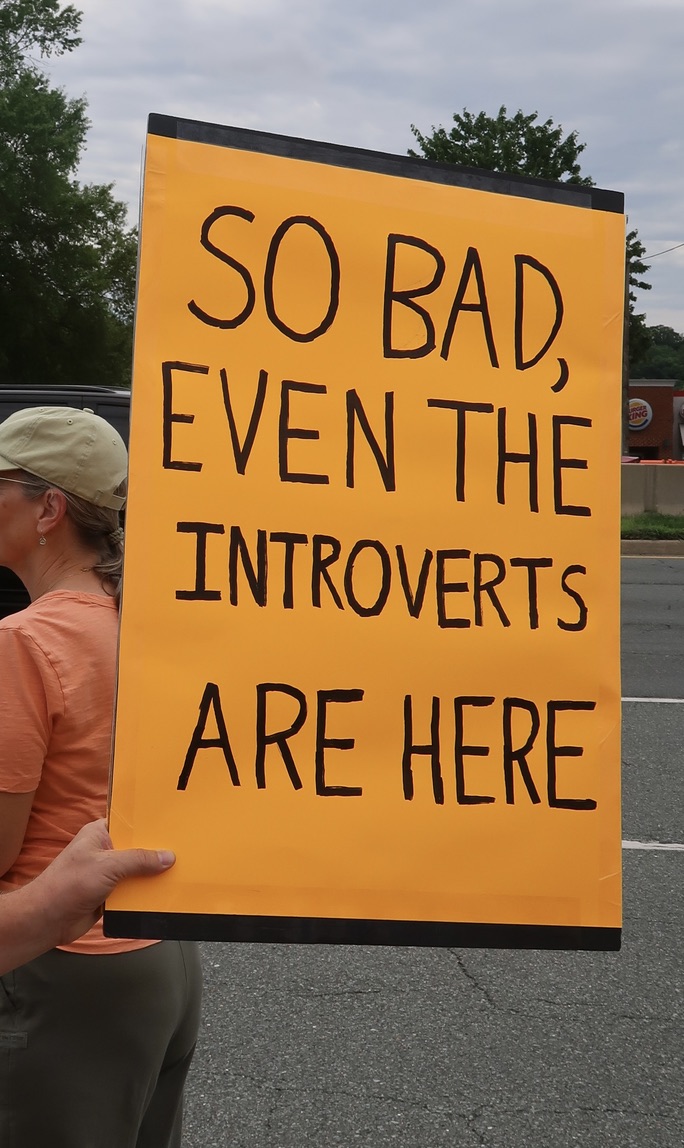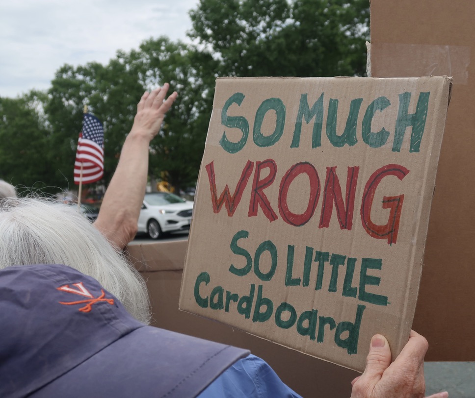 Regarding safety, today’s rally in Charlottesville was orderly and secure, with hundreds of motorists honking in support and fewer than a handful bellowing curses out the window or enjoying the breeze on their middle fingers. I saw no police and no National Guard troops, despite Virginia Governor Youngkin’s manifest desire to establish that he’s just as “tough” (and cynical, and confrontational, and misguided) as Greg Abbott.