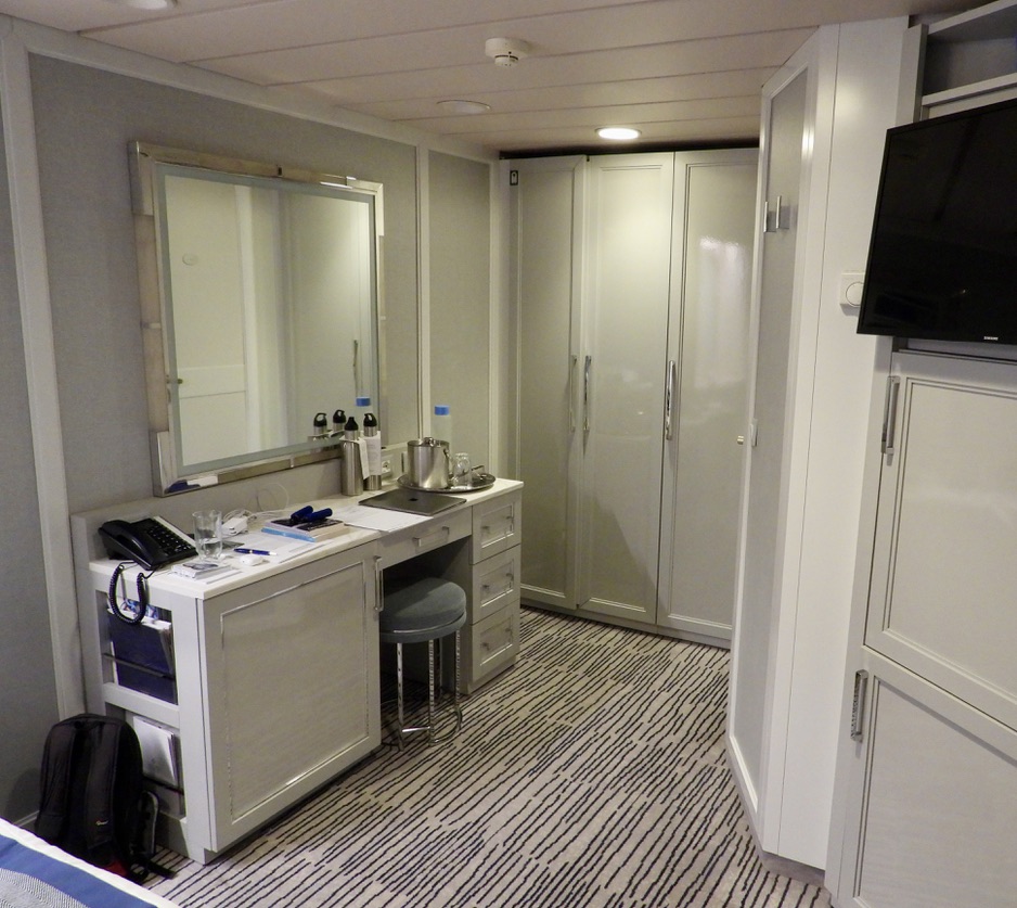 And now for the stateroom.  As expected, the cabin is small, but there’s plenty of storage space, a bathroom that is adequate despite being somewhat narrower than my arm span, and – Hosanna! – shower doors rather than a clingy plastic curtain.