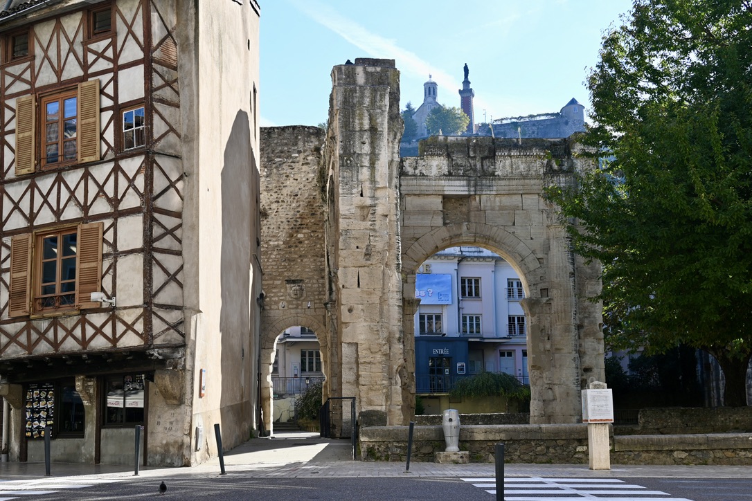 Heading back down the hill, we walked through the site of the old Roman Forum, whose remaining gate abuts a 14th century half-timbered house. If you stand across the street from the gate, you can see three eras of Vienne’s history (Roman, medieval, and in the background, modern (the Chapelle)) in one glance.
