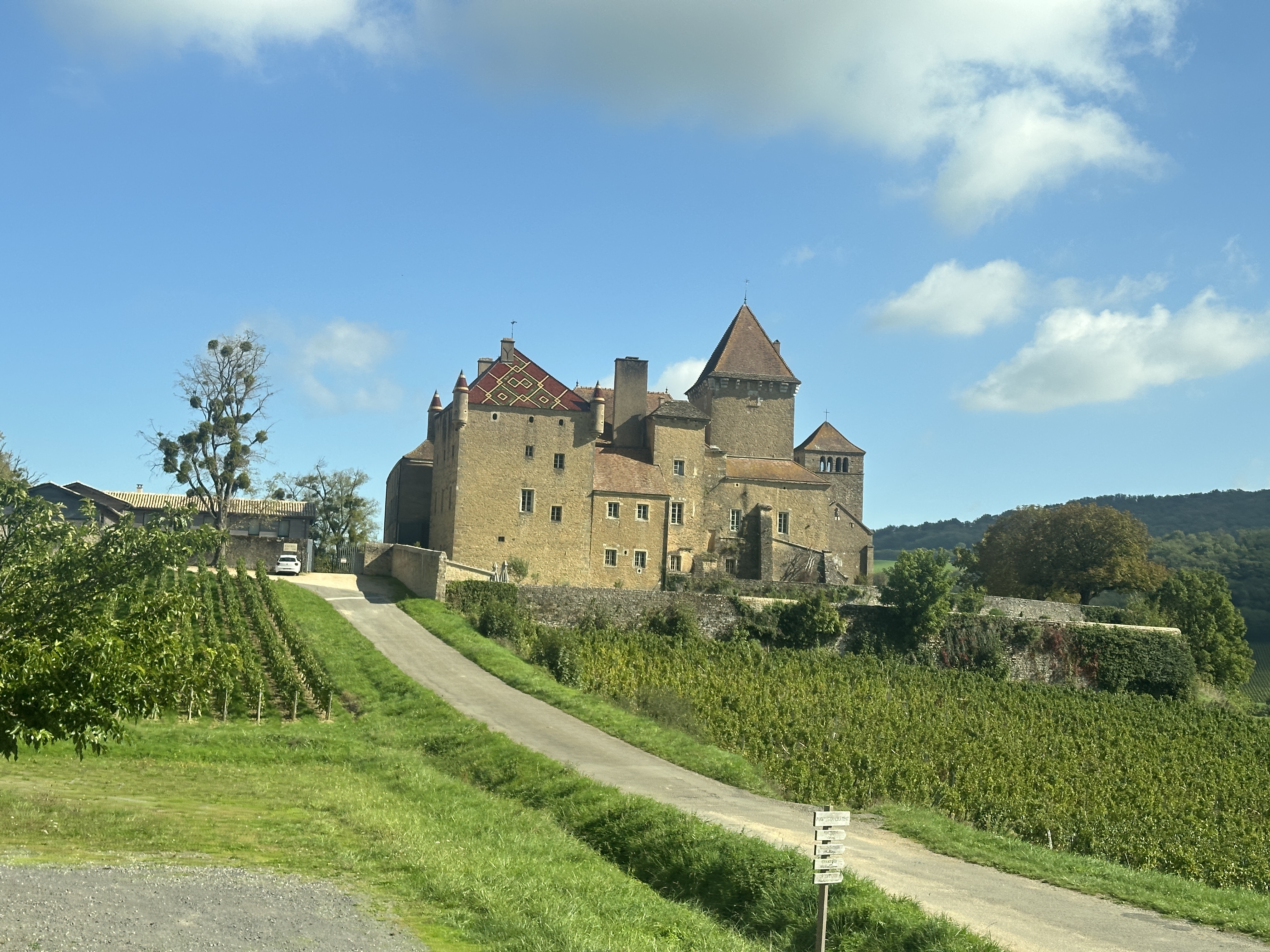 Being in Burgundy, and having pedaled away yesterday’s wine, I naturally signed up for a winery tour this afternoon. So, after lunch and wandering around the center city area in Mâcon, I boarded a bus to Chateau de Pierreclos, a centuries-old winery perched in the rolling hills outside Mâcon.