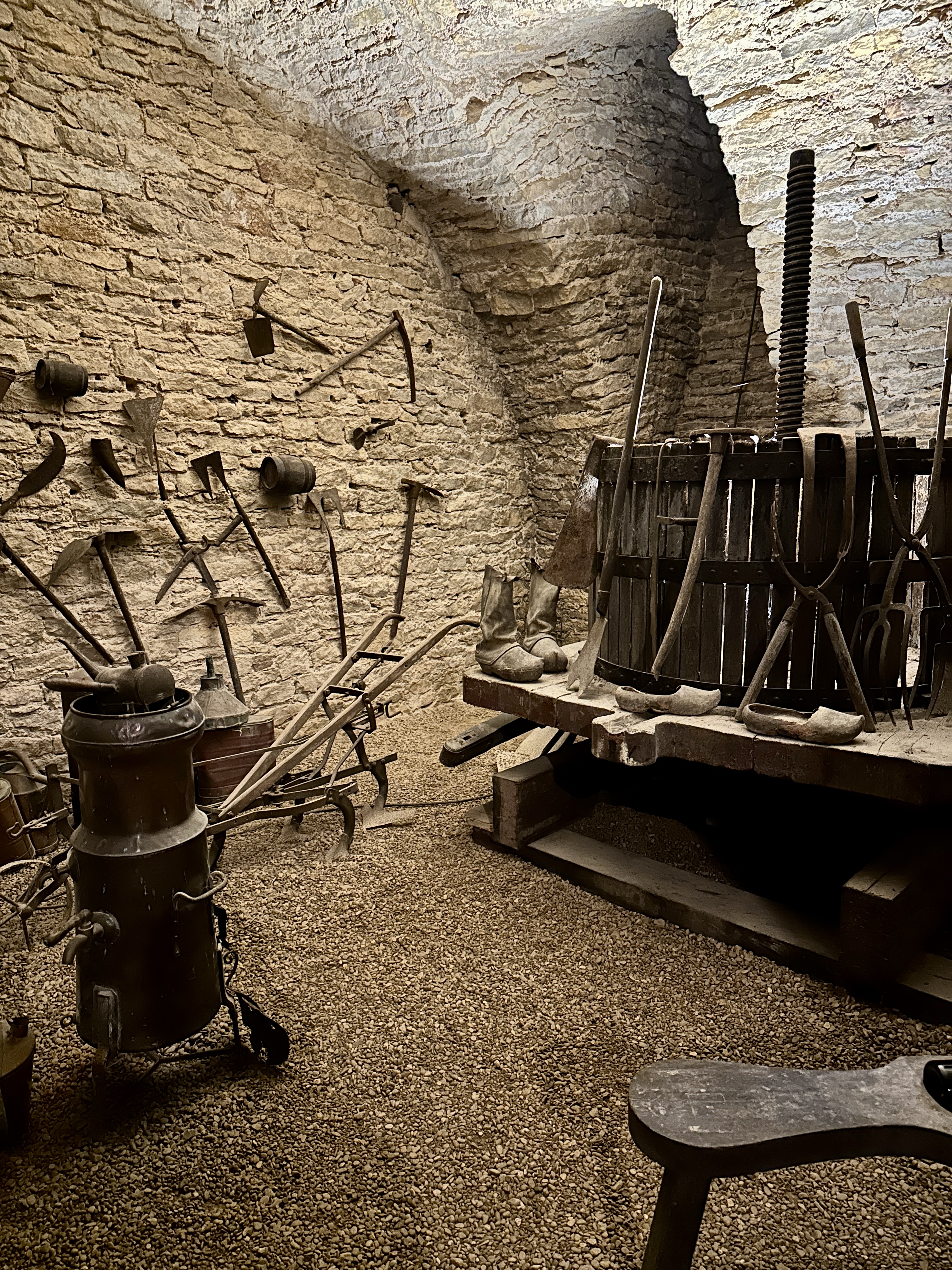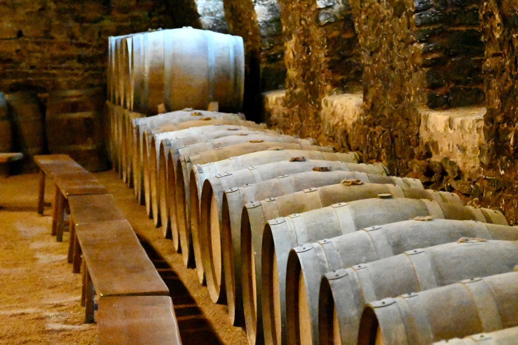 The cellar’s walled with oaken casks