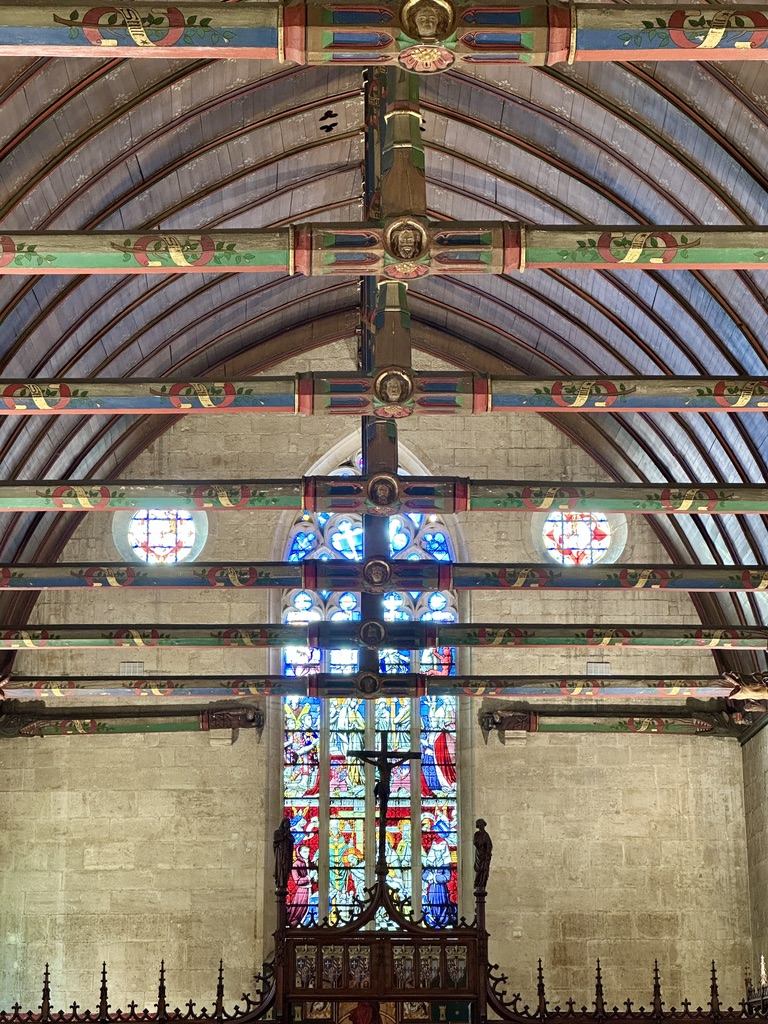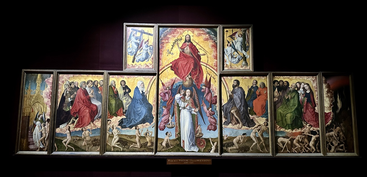 With respect to the latter, the ceilings above the beds depicted dragons to warn patients what awaited sinners in the afterlife, and a chapel was installed at the end of the ward (“La Salle des Pôvres”).  The chapel featured a magnificent “polyptych” showing the Last Judgment.  The original is in a climate-controlled room elsewhere on the premises; the chapel contains a replica.
