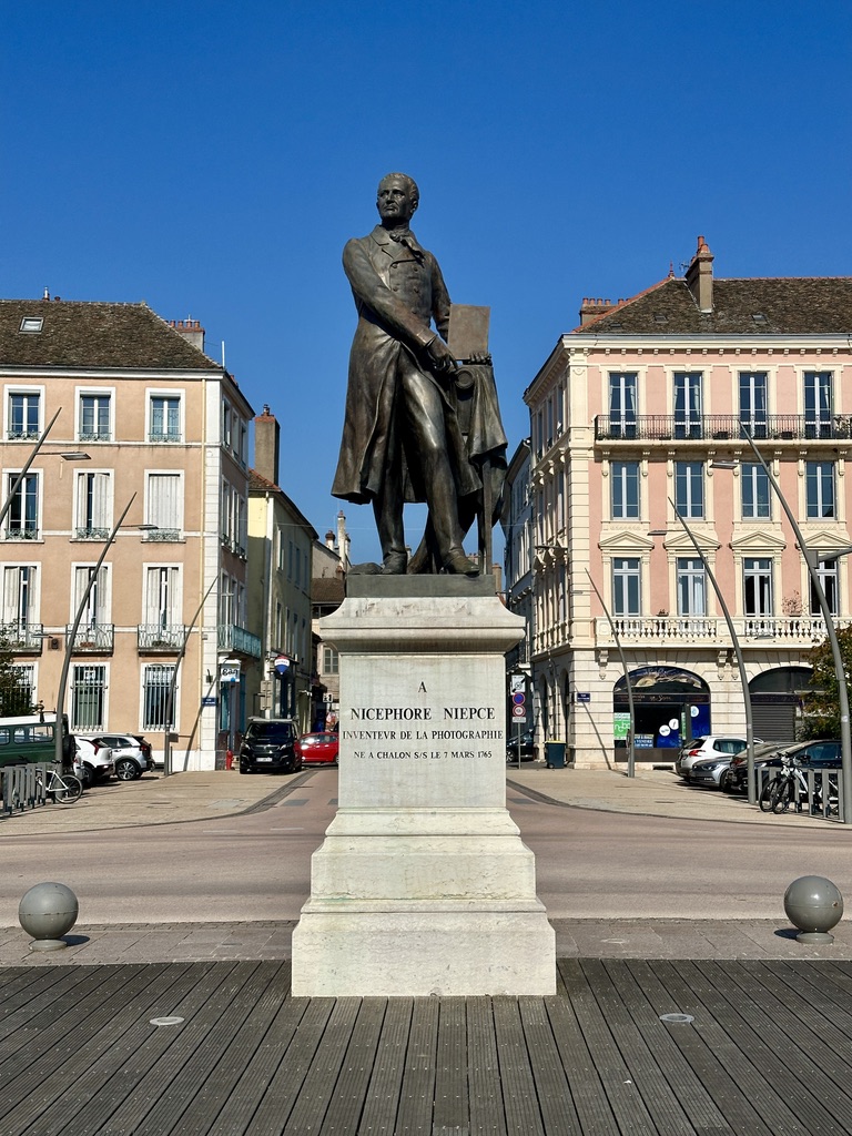 Niépce’s first picture was of the courtyard of his home, which required an eight-hour exposure.  I can only imagine what he would have thought had he seen me taking a picture of his statue using a tiny rectangle that also allows me to play music, talk to people, and obtain disinformation from millions of sources. When Louis Daguerre heard of Niepce’s success, he asked to go into business with him; shortly after they did, Niépce died and Daguerre got credit for the new technology.