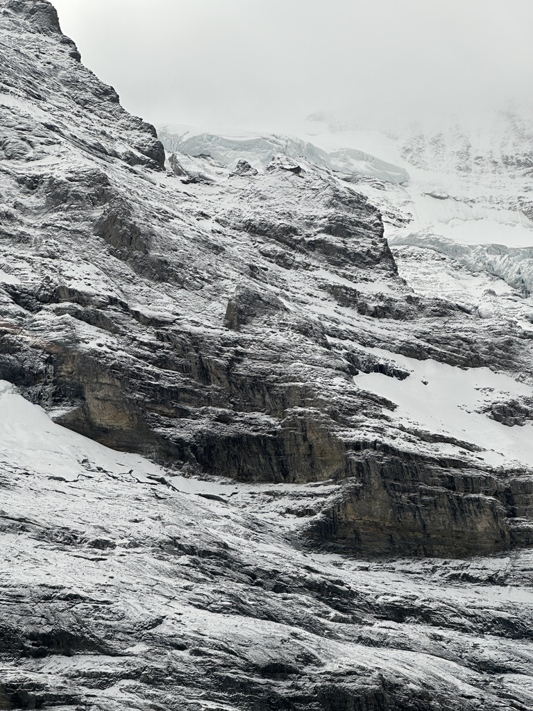 From Eigergletscher, we switched to a cog railway that brought us all the way up to Jungfraujoch (3454 meters (11,332 feet).  The higher we climbed, the wilder the scenery became, with peaks appearing and vanishing at the whims of the clouds, glistening glaciers, and striated rock dusted with snow.