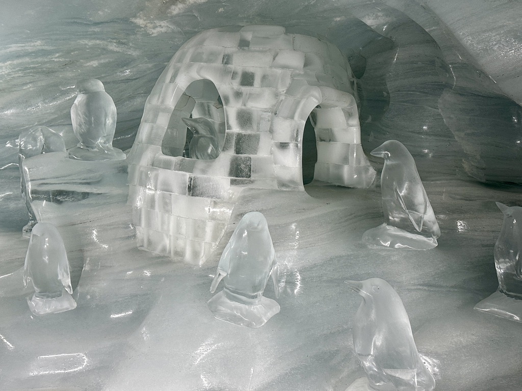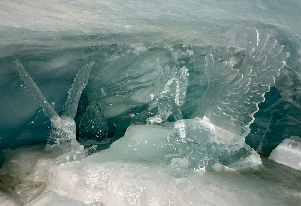 After spending a few minutes outside – the terrace was mostly sheltered from the wind – we went back down to the oval and walked another five minutes to the Eispalast (Ice Palace).  The Ice Palace is an ice-floored tunnel (somehow treated so that it wasn’t too slippery; there’s also a handrail) with chambers housing spectacular ice sculptures.