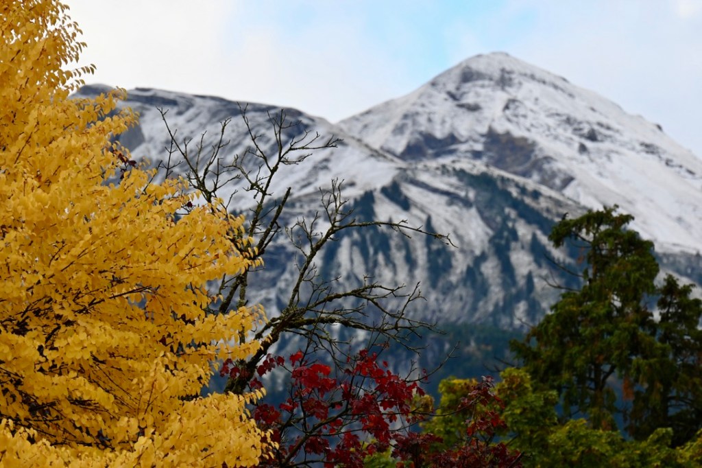 Last night’s rain yielded fresh snow atop the surrounding mountains, creating vistas out of a fairy tale.