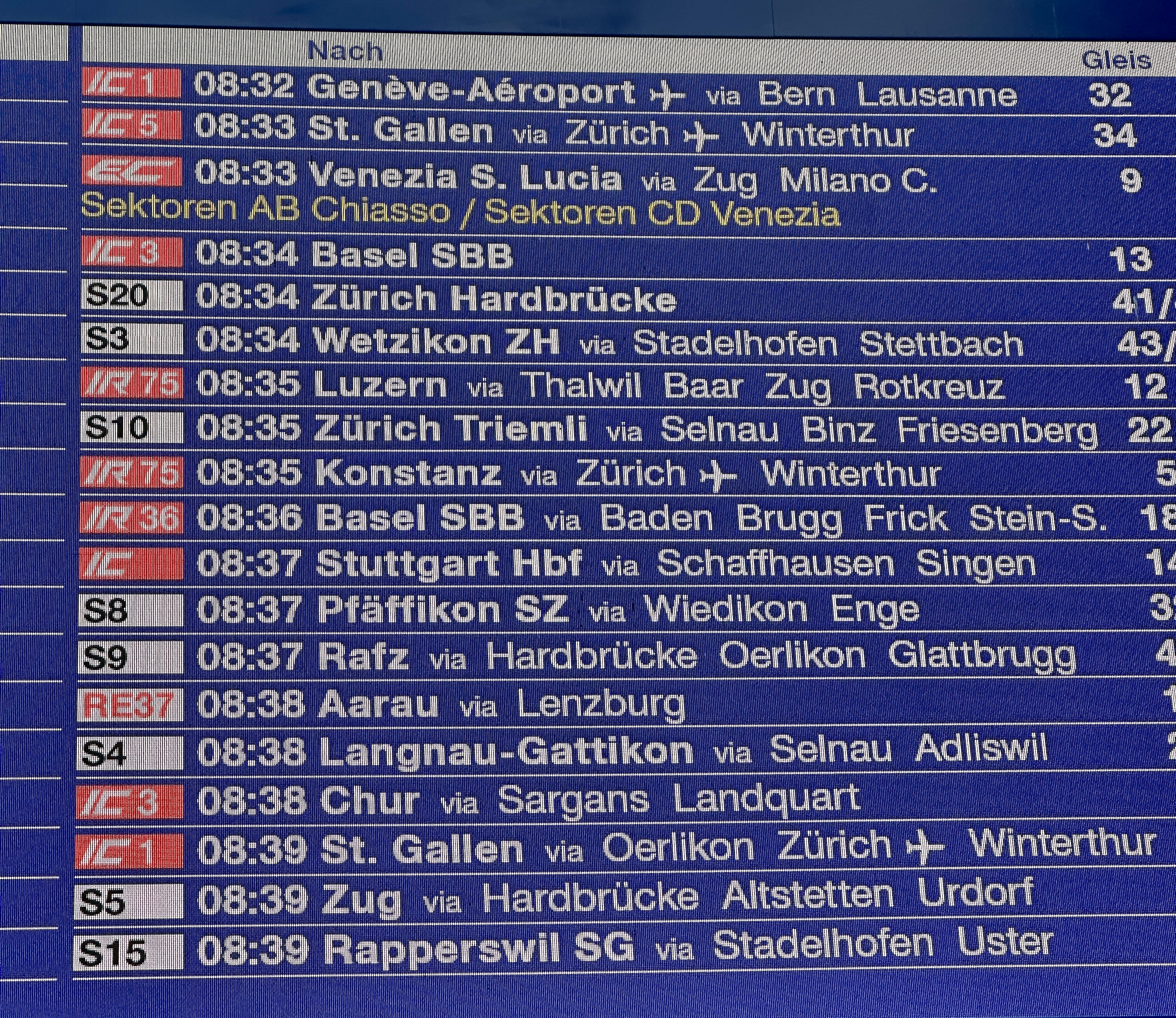1. Love that shot of the departures board at Zurich HB. One could always set one’s watch by train departure times. If the board said it departed at 8:32, it departed at 8:32. Just like Amtrak…NOT! 🙂