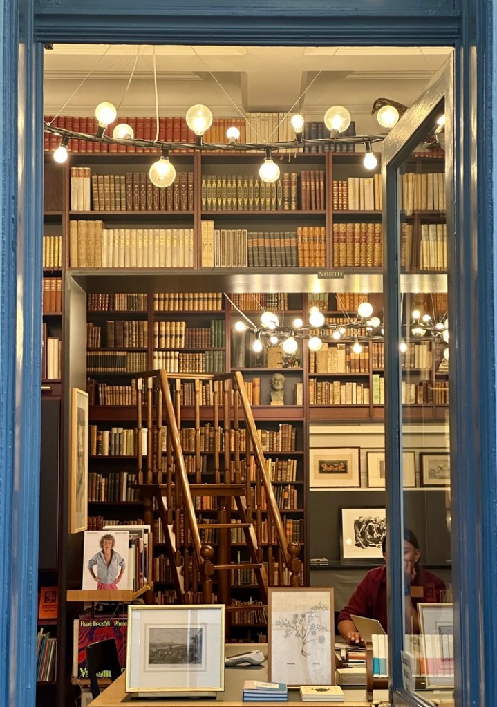 Instead of walking directly along the river, we headed one block inland to stroll the narrow streets that parallel the main riverfront thoroughfare.  Those lanes are lined with small shops selling leather goods, art, crafts, designer shoes and clothes, and (yay!) books, along with restaurants and cafes of every stripe.