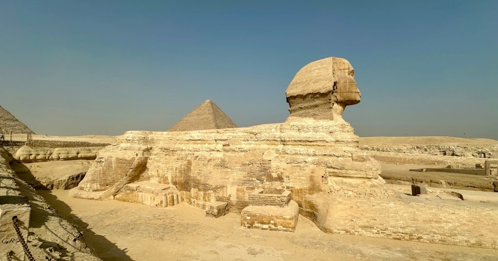 After emerging, we walked around the rest of the complex, stopping to admire the colossal Sphinx (Khufu’s head on the body of a lion).