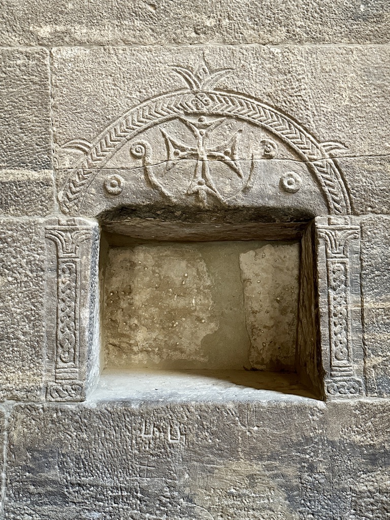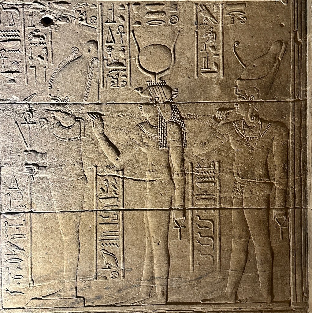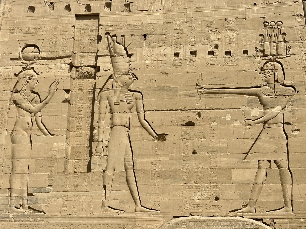 The focal point of the Philae complex is the temple of Isis, built starting in the 4th century BCE. Sitting at the end of a courtyard surrounded by inscribed pillars, the temple to Isis is a palimpsest whose hieroglyphics and depictions of Isis, Horus, and Osiris are occasionally effaced or overwritten by signs of its later conversion to a Coptic Christian basilica designated to St. Stephen.