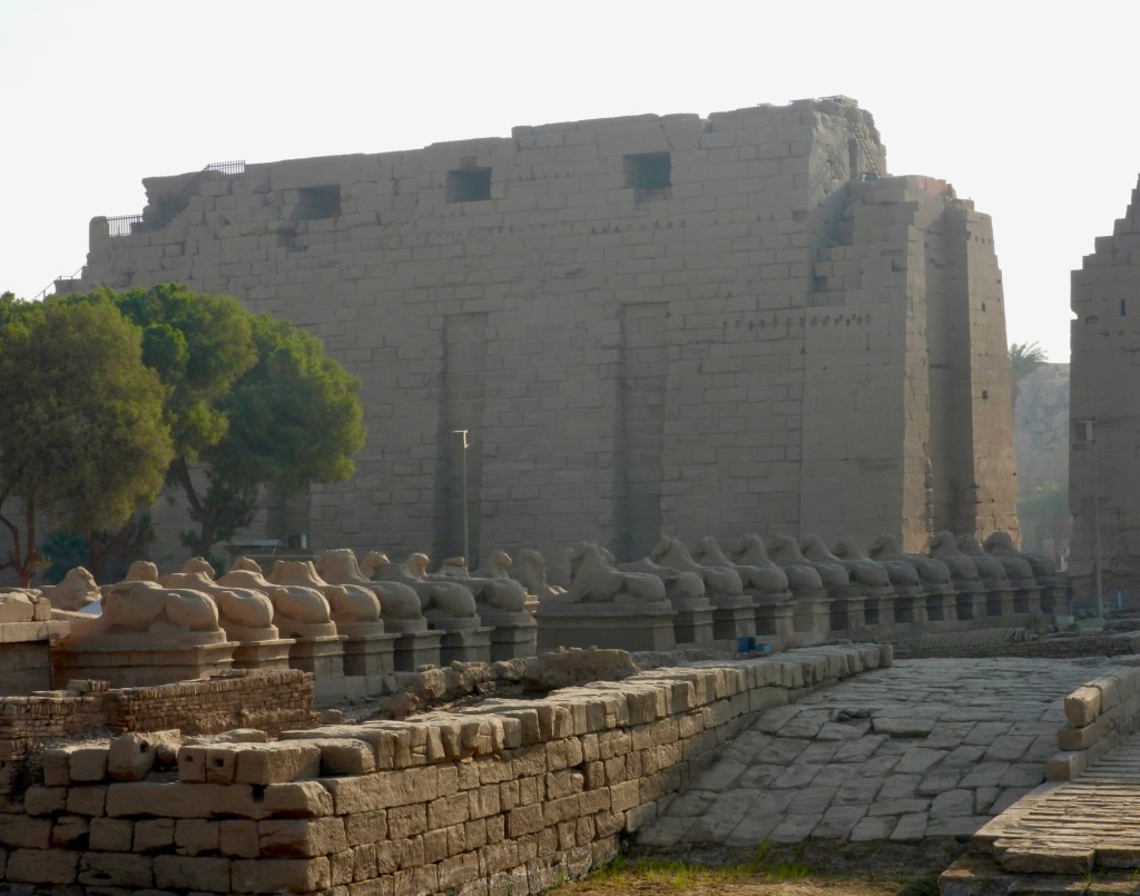 My stock of superlatives has been sorely depleted on this trip. The Giza pyramids, the Sphinx, King Tut’s treasures, Abu Simbel, the Necropolis – there are only so many adjectives available to describe these triumphs of human artistry and achievement. Today, we visited perhaps the most impressive of all the sites we’ve seen: Karnak Temple, located on the east bank of the Nile across from the Necropolis. (Ancient Egyptians associated the east with birth and the west with death; they euphemistically called the dead “westerners.”)