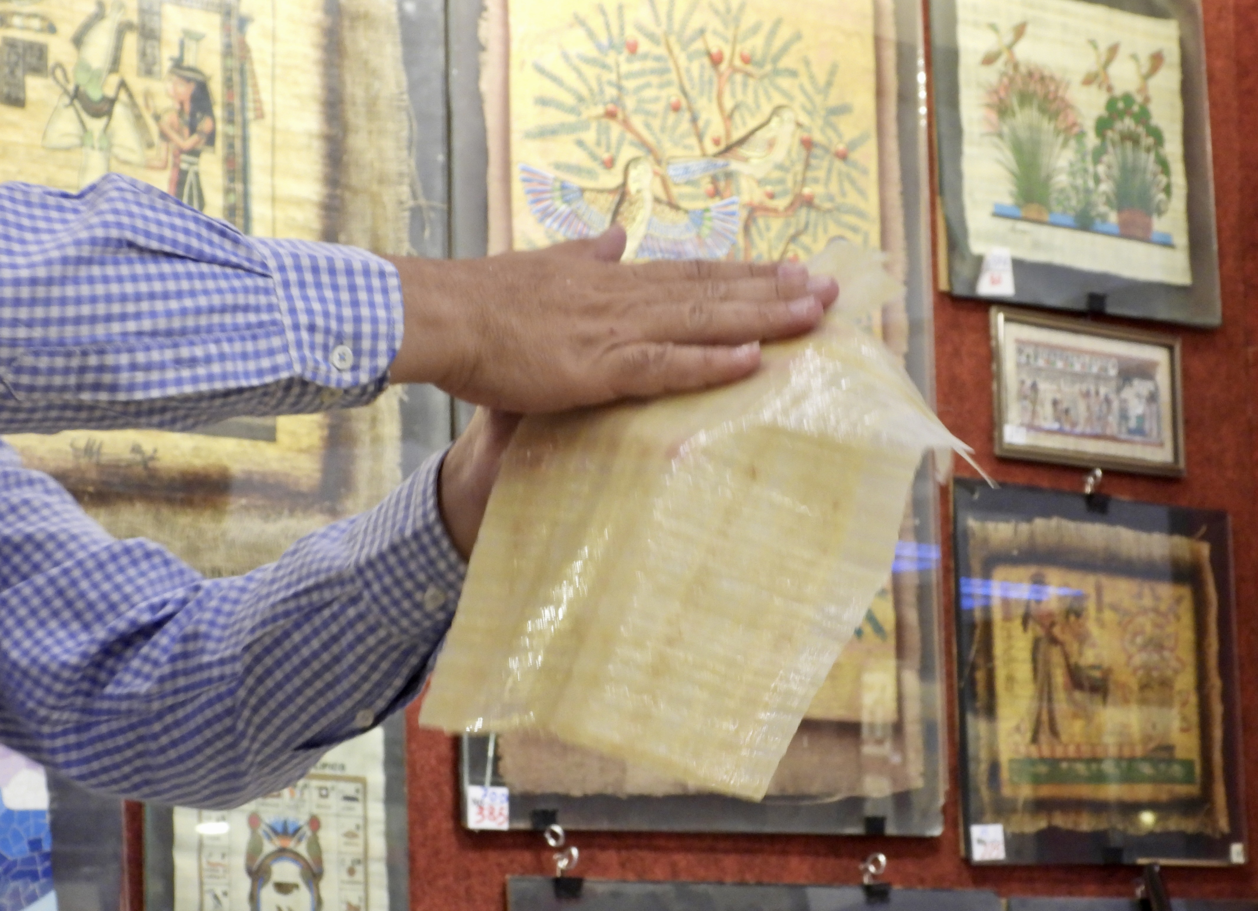 Five minutes from Karnak, we stopped for an interesting papyrus-making demonstration at the New Isis Papyrus Museum. It’s not a museum in the sense of displaying ancient documents. Rather, it’s home to the works of thirty artists who paint on papyrus. Their subjects cover a range of Egyptian themes: ancient deities, well-known scenes from tombs, colorful skylines of old Cairo, and much more. I think at least three-quarters of our group (including me) purchased something.