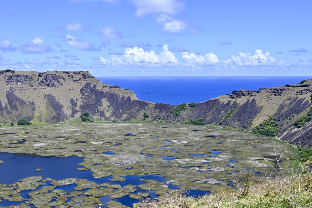 Adjacent to Orongo, there’s a caldera from which aspirants clambered down a nearly vertical cliff into the ocean, swam a couple of kilometers through shark-infested waters to a nearby island, and waited days or weeks in caves for sooty terns to arrive and lay eggs.