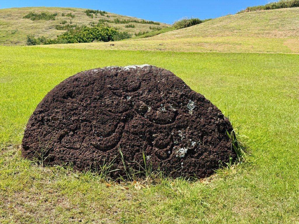 Statues of particularly important ancestors (tribal leaders and other VIPs) are indicated by top knots (pukao), and our next stop, Puna Pau, is where the stone used for the top knots (red scoria) was quarried. Several unfinished pukao lie on the ground, and there are beautiful views of the coast from site.