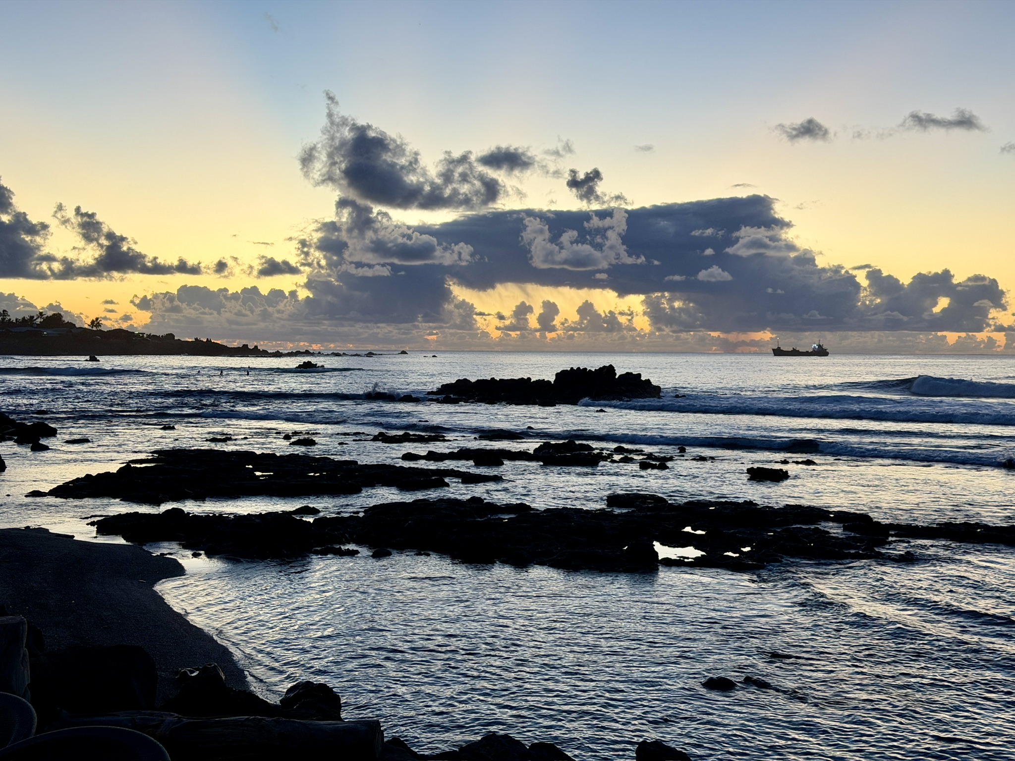 After our full day, Shari and I returned to our AirBnB, rested up, then went for a delicious dinner at Te Moana, a waterfront restaurant in Hanga Roa. I fell into bed around 11 and am happy to say I had no dreams of falling off cliffs, fending off sharks, or filching eggs from sooty terns.