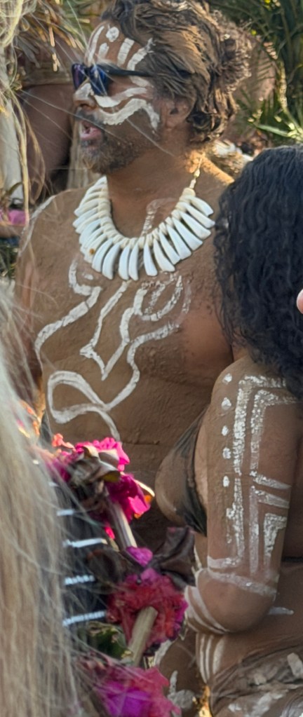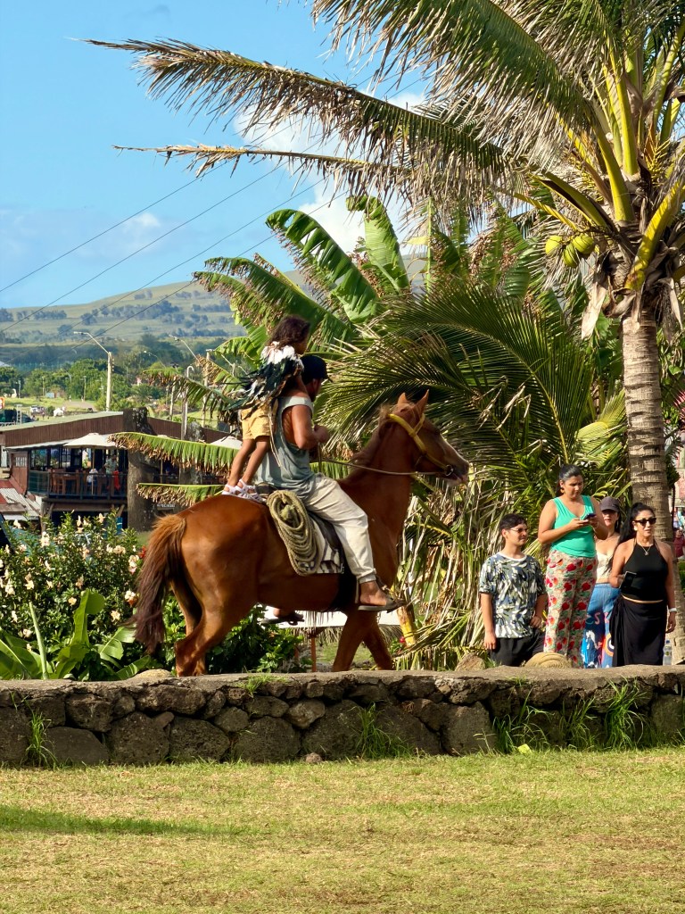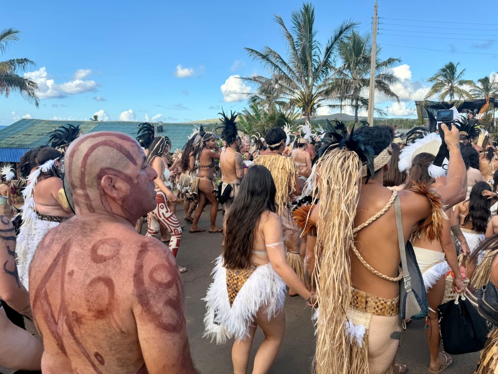 The highlight of the day was the parade marking the end of Tapati. Everyone, from small children to the wizened, dressed in traditional garb, and many of the men wore body paint. Although the outfits would be considered “indecent” in America, in Rapa Nui they are simply what people used to wear – though they certainly made for a “cheeky” performance.
