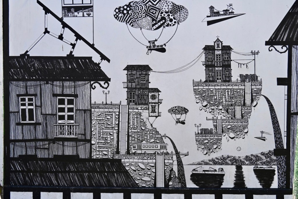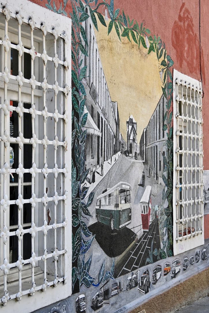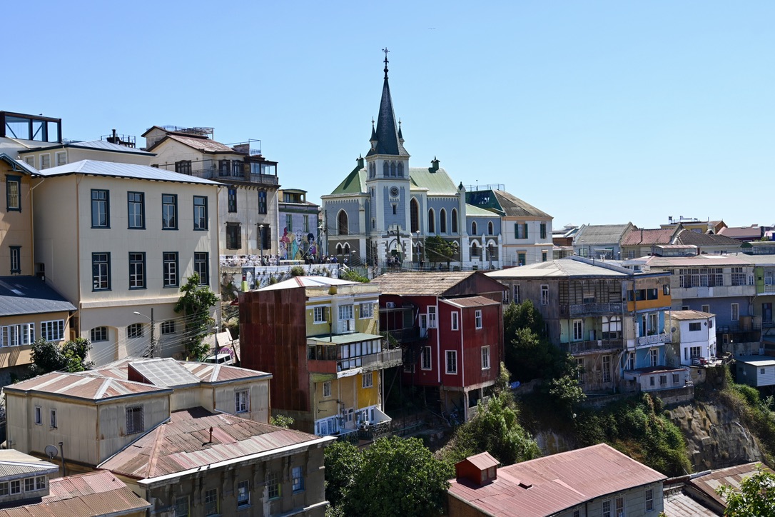 From the market, we strolled around two of Valparaiso’s many hills, Cerro Alegre (commonly called “Happy Hill”) and Concepcion Hill (Cerro Concepción). The hills’ flanks are covered in 19th century buildings, many sided with vividly painted corrugated metal.