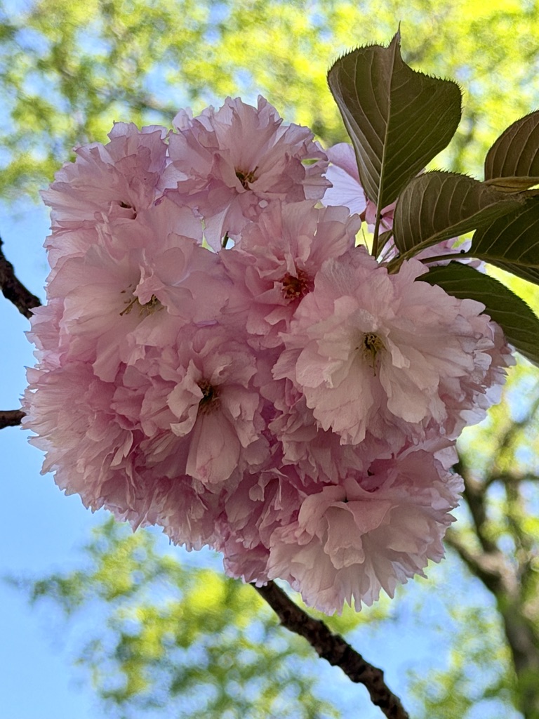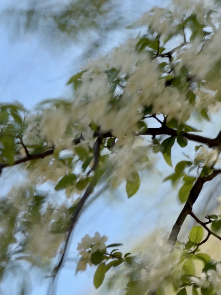 This morning, he took me to the local elementary school, where he likes racing around the baseball field then throwing himself on the ground and wriggling.  Sheer joy, for him and for me. Elsewhere on the walk, we passed many more blossoms dancing gently in the breeze.